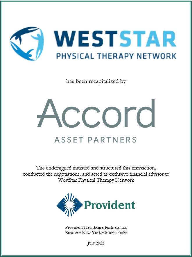 “We’re proud to have represented WestStar in its partnership with Accord and Paras. Geoff and his team have built one of the leading networks of workers’ compensation and auto-injury focused physical therapy clinics in Southern California,” commented Jake Vesely, Director at Provident Healthcare Partners. “With Accord and Paras, WestStar has the resources and expertise to broaden its reach across California and into new states, and we look forward to following their continued success.”